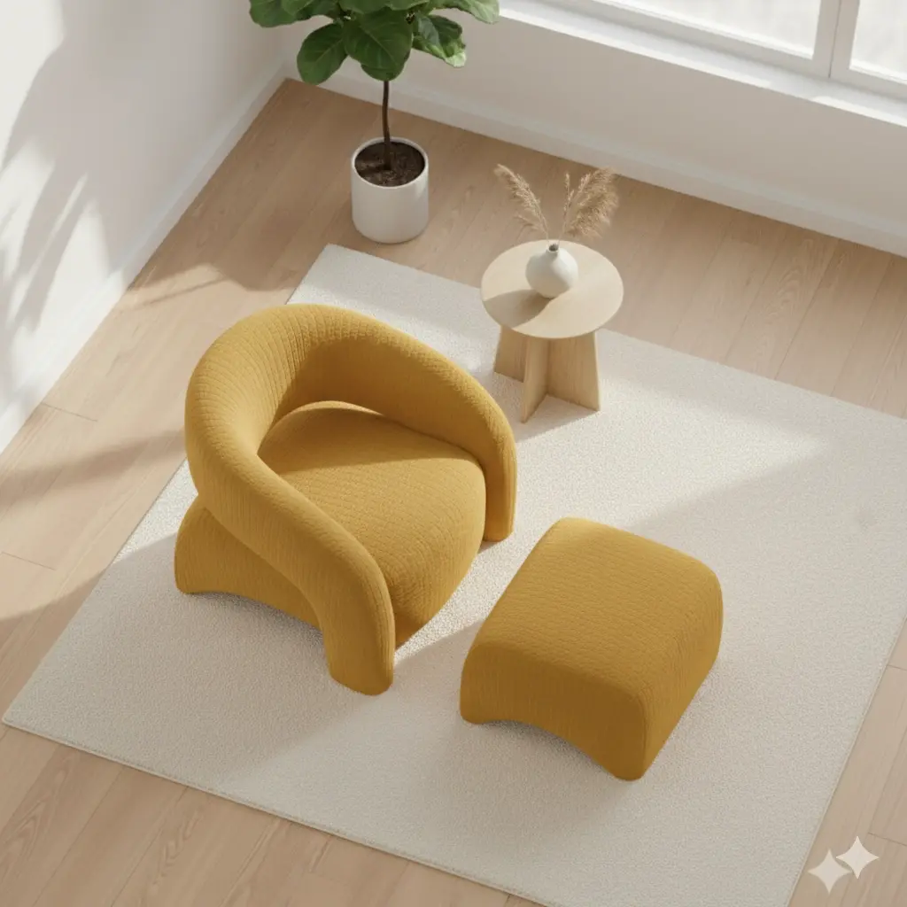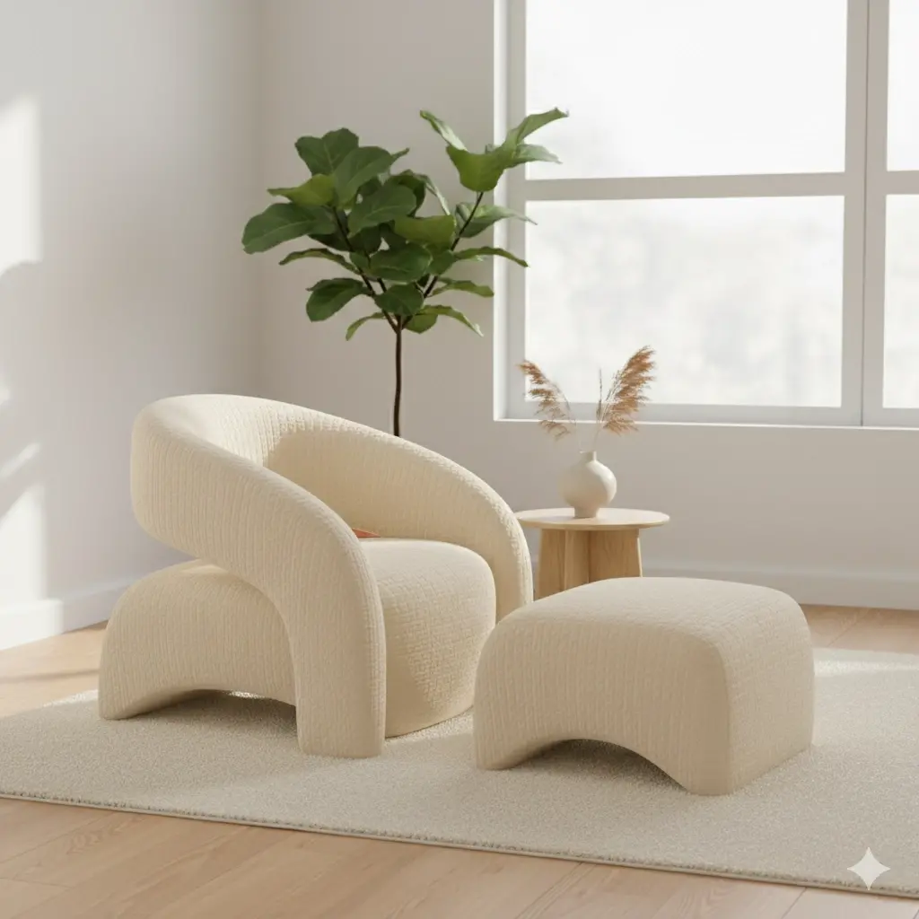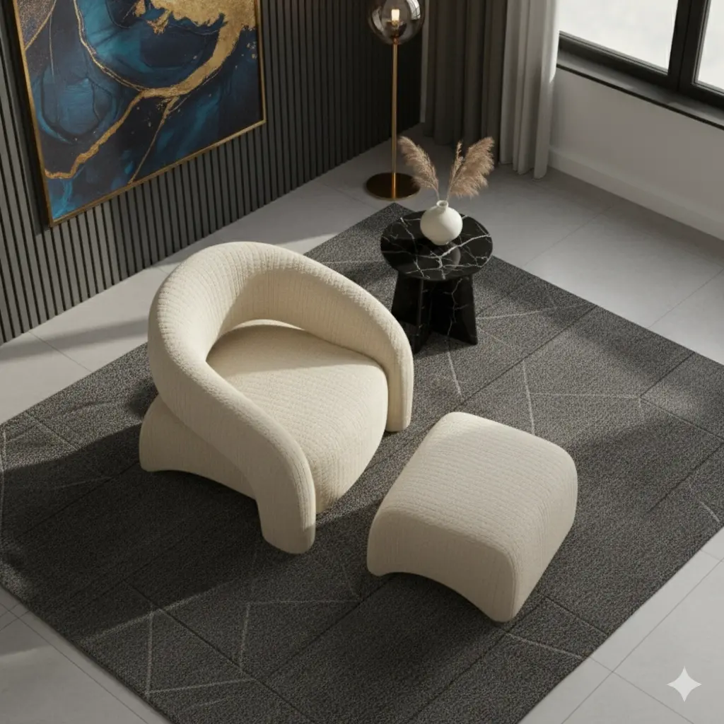 Sculptural Form: Bir mobilyadan çok, salonun ortasına bırakılmış modern bir sanat eseri gibi duran kıvrımlı silüet.