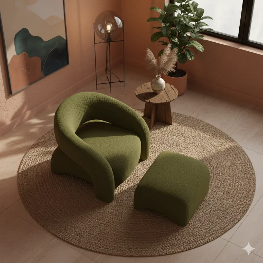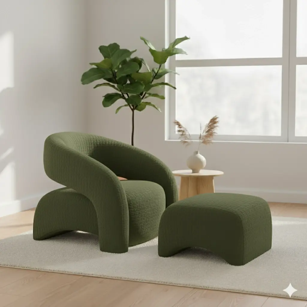 Bu set, "Organic Fluidity" (Organik Akışkanlık) prensibiyle şekillendirilmiştir. Koltuğun sırtı ve kolları, kesintisiz bir "C" formu çizerek oturani nazikçe sarmalar (embrace). Tasarımın en karakteristik imzası, hem koltukta hem de pufun tabanında bulunan "Arched Cutout" (Kemerli Kesit) detaydır. Bu mimari boşluklar, dolgun ve kütlesel gövdeyi görsel olarak hafifleterek zeminde dengeli bir duruş sergiler. Seçilen mat yosun yeşili (moss green) dokulu kumaş, "Biophilic Design" (Doğayı Seven Tasarım) akımına atıfta bulunarak, iç mekana orman havasının sakinleştirici enerjisini taşır.