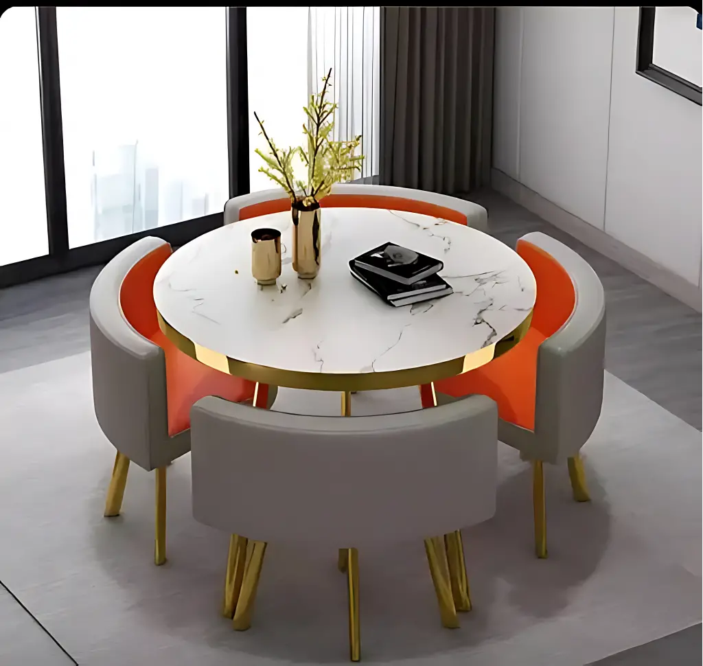 Zarif tasarımıyla dikkat çeken bu yuvarlak masa takımı, dört adet sandalyesiyle birlikte hem şıklık hem de konfor sunar. Yuvarlak formu sayesinde sandalyeler masanın etrafına tam uyum sağlar, köşe boşluğu bırakmadan estetik bir görünüm oluşturur. Kompakt yapısı ile dar alanlarda bile ideal bir kullanım sağlar.