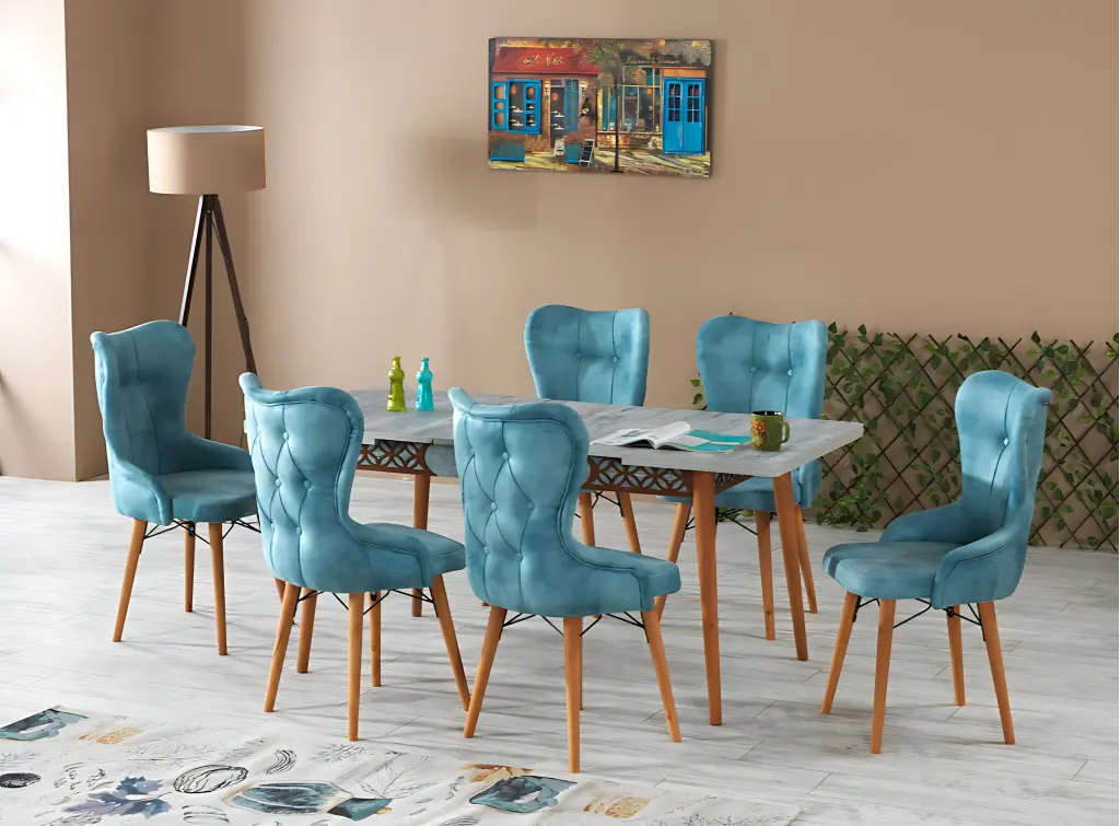 İhtişamlı tasarımı ve zarif detaylarıyla öne çıkan bu masa takımı, yemek alanlarınıza adeta kraliyet havası katıyor. Geniş dikdörtgen masa formu, sağlam yapısı ve göz alıcı ayak tasarımıyla dikkat çekerken, 6 adet konforlu sandalyesiyle hem estetik hem de rahatlık sunuyor. Şıklık ve kaliteyi bir arada isteyenler için mükemmel bir tercih.