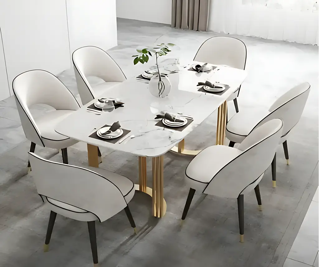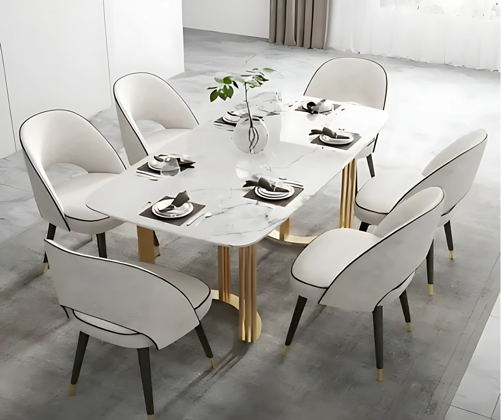 Zarafet ve konforu bir araya getiren bu masa takımı, şık cam yüzeyi ve yuvarlatılmış köşe detaylarıyla modern yaşam alanlarına sofistike bir dokunuş katıyor. 6 adet lüks sandalye, ergonomik ve yumuşak oturum yapısıyla uzun süreli kullanımlarda bile üstün rahatlık sağlıyor. Hem günlük yemeklerde hem de özel davetlerde prestijli ve şık bir kullanım sunuyor.