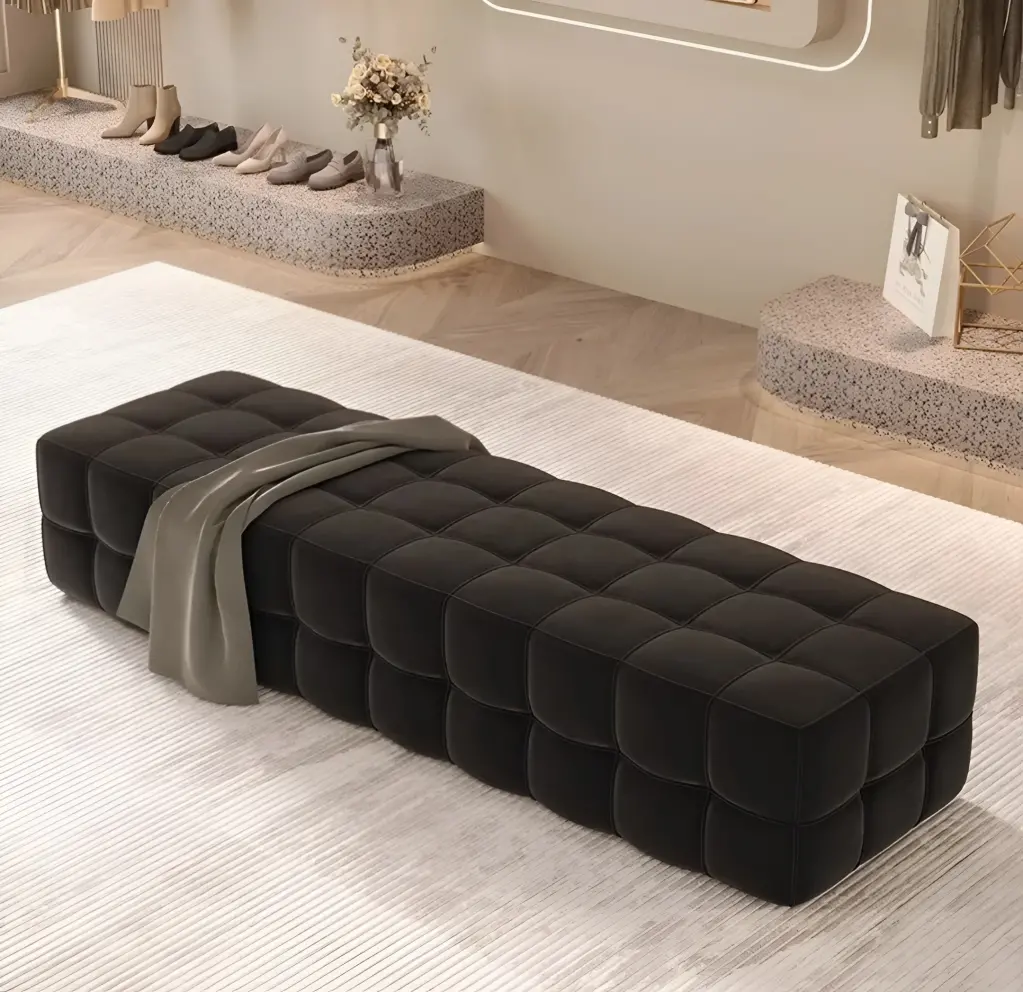 Bu tasarım, "Biscuit Tufting" (Kare Kapitone) tekniğinin en modern halidir. Yüzeyi kaplayan derin dikişli kareler, ürüne üç boyutlu, pofuduk bir "çikolata barı" veya "piksel" dokusu kazandırır. Bu ritmik geometri, mat siyah kadife/nubuk kumaşın ışığı emen yapısıyla birleşince ortaya inanılmaz derecede zengin ve "yumuşak" bir kütle çıkar. Ürünün gizli ayak yapısı (floating effect),sanki zeminde süzülüyormuş gibi görünmesini sağlar, ancak kütlesel duruşuyla odanın odak noktasını (focal point) oluşturur.