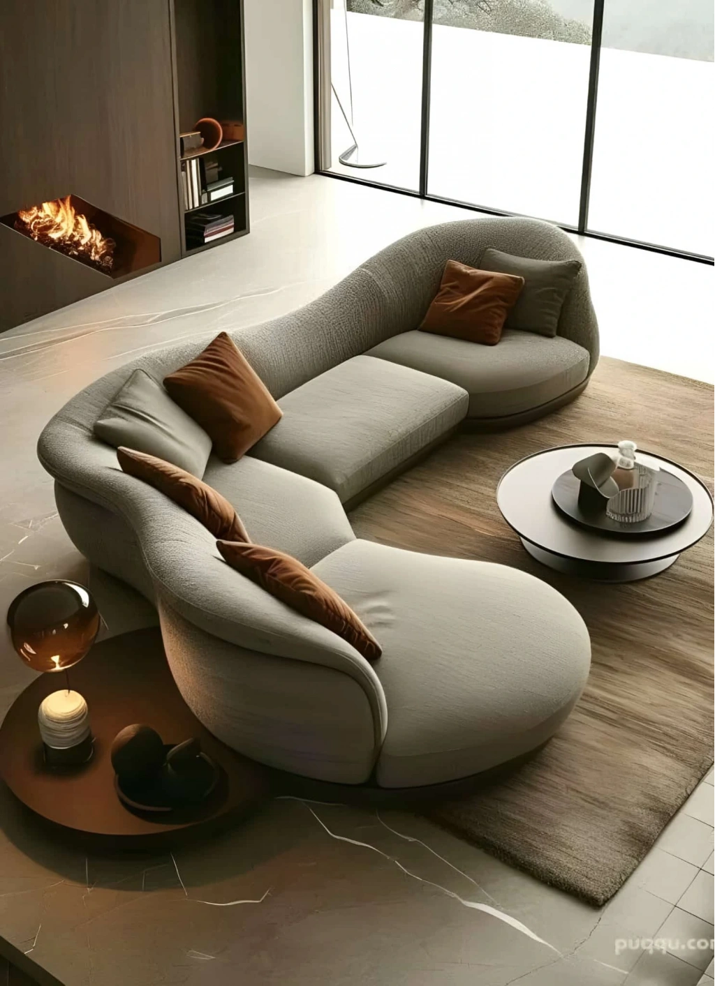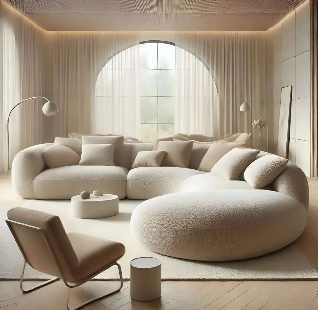 Keskin köşelerden arındırılmış bu organik tasarımlı kanepe, yaşam alanlarında akıcı ve yumuşak bir geçiş sağlar. Geniş "C" formu veya fasulye tipi yapısı, karşılıklı sohbet ortamlarını desteklerken odaya heykelsi bir sanat eseri havası katar. Alt kısmındaki ahşap baza detayı, modern kumaş dokusuyla sıcak bir kontrast oluşturur. Sırtı ve kolları bir bütün halinde saran yapısı sayesinde hem ergonomik hem de estetik bir bütünlük sunar.