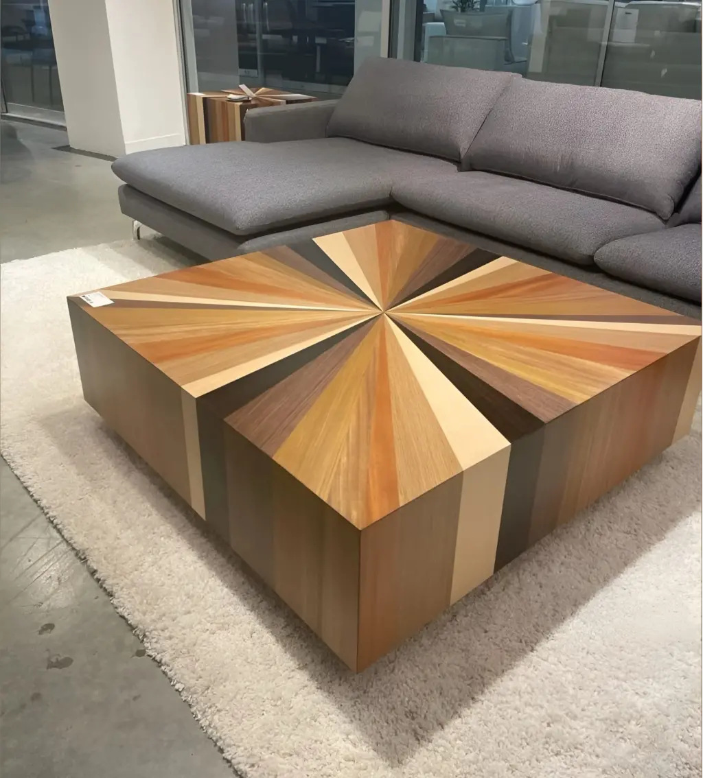 Bu tasarım, "Radial Marquetry" (Radyal Marketeri) sanatının modern bir yorumudur. Sehpanın tam ortasındaki "sıfır noktası"ndan dışarıya doğru patlayan ışınlar; ceviz, meşe, kiraz, tik ve abanoz gibi farklı ağaç türlerinin renklerini bir araya getirir. Bu çok renkli yapı, sehpanın odadaki her türlü ahşap mobilya ile (ister açık, ister koyu olsun) kusursuz uyum sağlamasına olanak tanır. Desenlerin üst tabladan yan yüzeylere kesintisiz akması (waterfall effect),ürünü bir mobilyadan çok, yekpare bir "ahşap bloğa" dönüştürür. Ayaklarının gizli olması, bu devasa kütlenin halı üzerinde "ağırlıksız" durmasını sağlar.