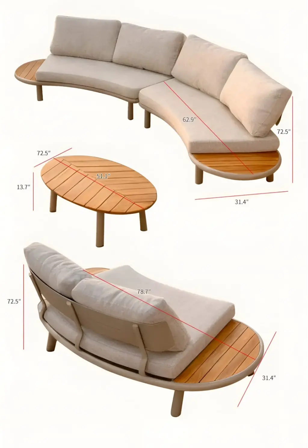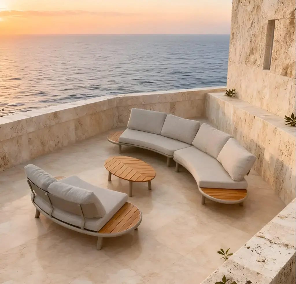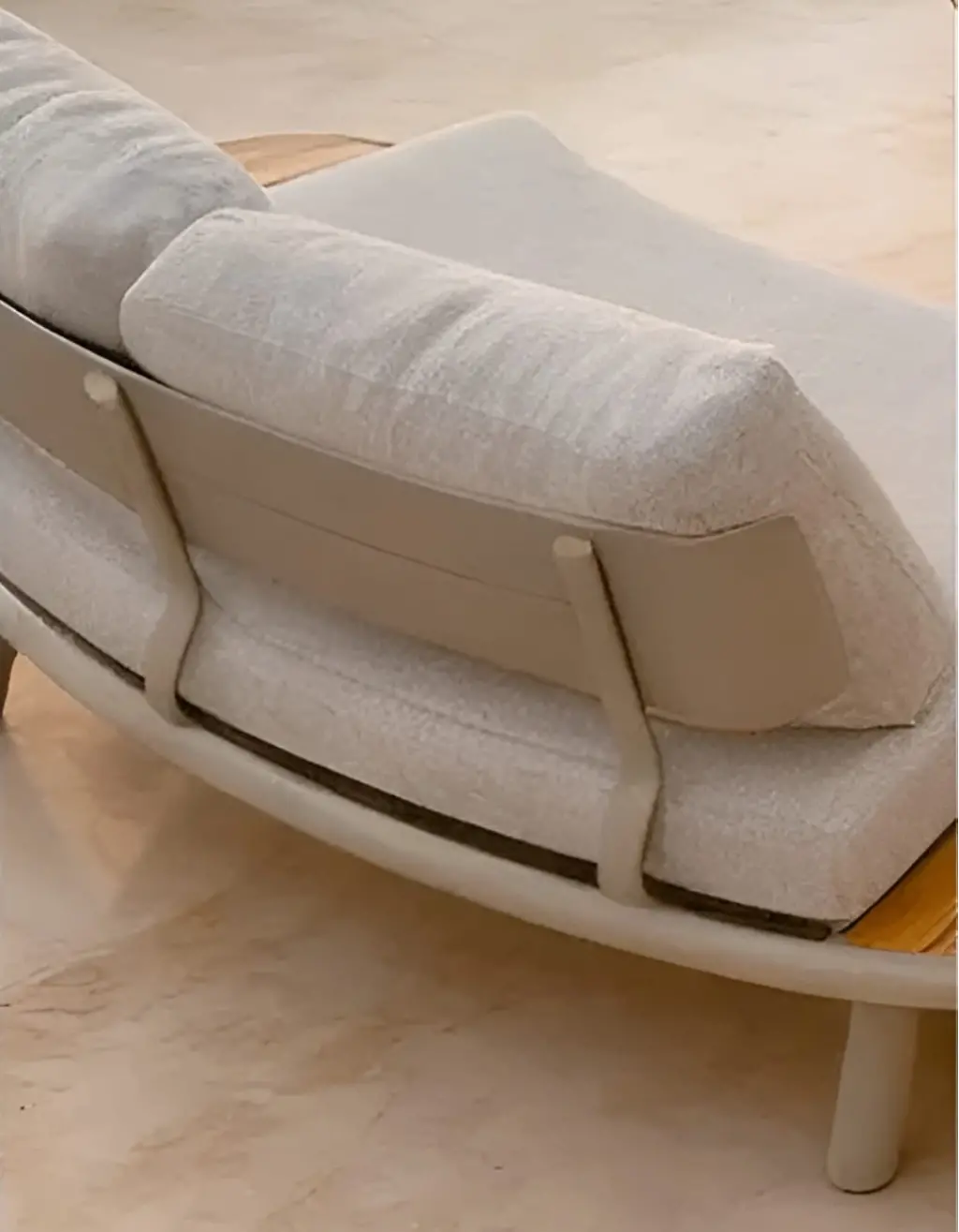 Bu tasarım, "Organic Fluidity" (Organik Akışkanlık) felsefesiyle, dış mekanın sınırsızlığını mobilyanın kıvrımlı hatlarıyla bütünleştirmek amacıyla kurgulanmıştır. Gövdeyi taşıyan ince metal iskeletin uçlarında yer alan masif ahşap tablalar (teak/iroko), tasarıma doğal bir sıcaklık katarak fonksiyonel sehpa alanları oluşturur. Açık gri tonlu, suya dayanıklı tekstil dokusu, amorf oturum minderleriyle birleşerek kullanıcıyı denize karşı sakin bir dinlenme deneyimine davet eder. Setin kavisli yapısı, terasın mimari sınırlarına uyum sağlarken merkezi odak noktası olan yaprak formlu orta sehpa ile görsel bir ritim tamamlanır.