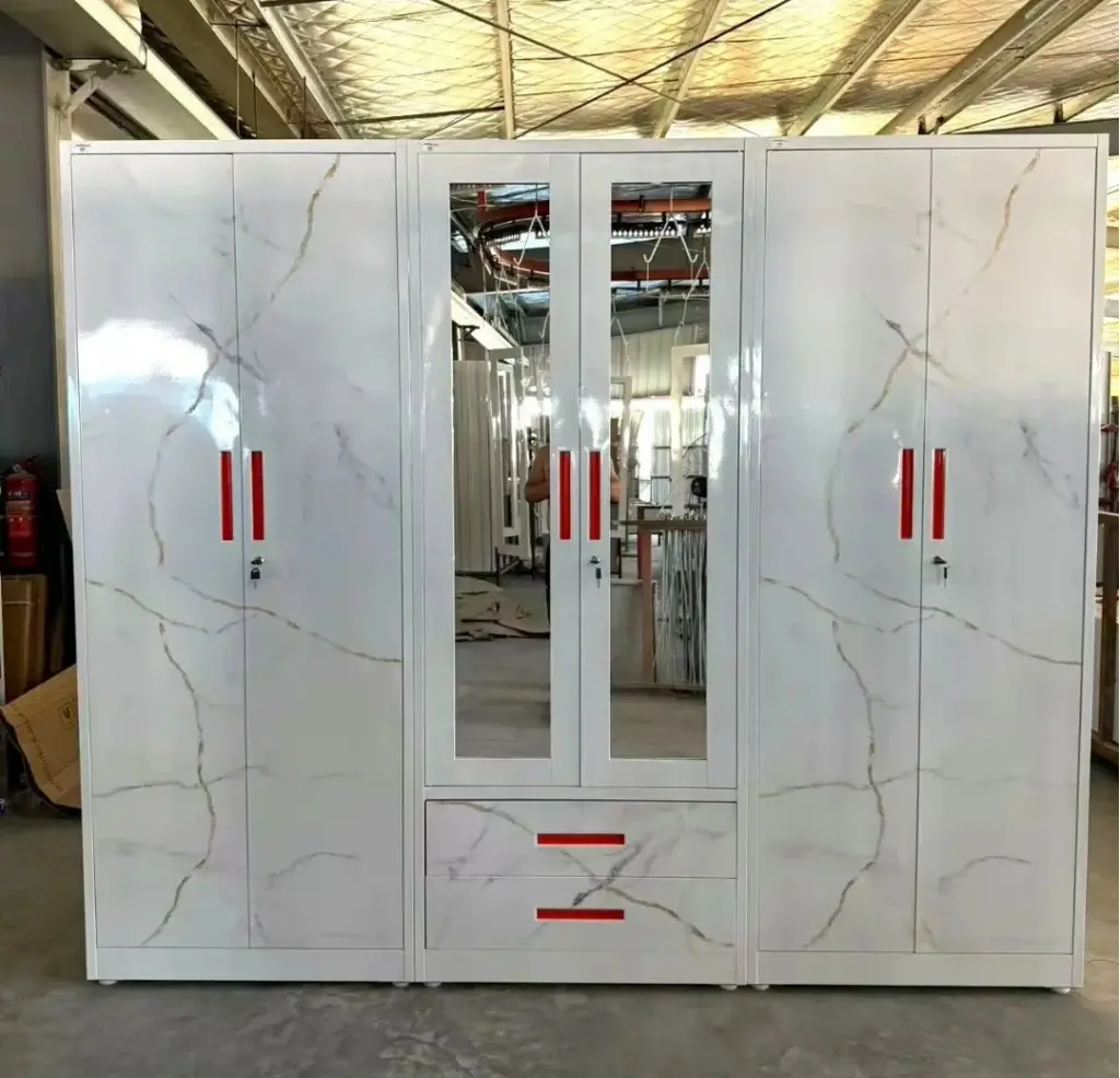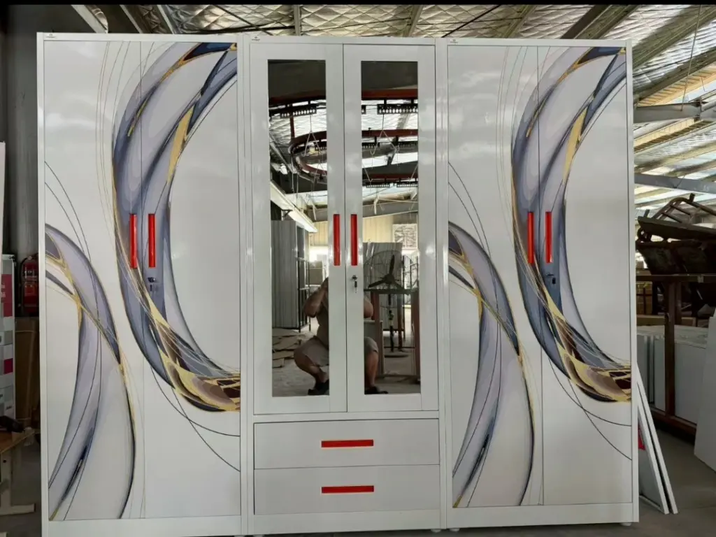Bu ünite, "Fluid Motion" (Akışkan Hareket) estetiği üzerine kuruludur. Yan blokları kaplayan devasa, "C-Formlu" soyut grafikler, mermer damarlarını andıran altın ve gri tonlarıyla beyaz zemin üzerinde dans eder. Bu dairesel akış, gözü otomatik olarak merkeze, yani çift kanatlı ayna bloğuna yönlendirir; böylece tasarım kendi içinde kusursuz bir simetri ve derinlik yaratır. Tasarımın en cesur ve avangart hamlesi ise parlak turuncu/kırmızı dikey kulplardır. Bu beklenmedik "kromatik patlama" (pop of color),grafik desenin ağırlığını kırarak ürüne genç, dinamik ve modern bir kimlik kazandırır.