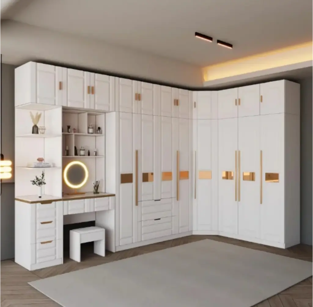 Bu tasarım, odanızın iki duvarını L-Tipi (Corner) mimariyle birbirine bağlayarak devasa bir depolama ve hazırlık sahnesi yaratır. Sistemin kalbi, sol kanatta yer alan "Entegre Güzellik İstasyonu"dur. Burada yer alan aydınlatmalı yuvarlak ayna (Ring Light),size profesyonel bir kulis deneyimi sunarken; hemen altındaki çekmece ve raflar kozmetik dünyanızı düzenler. Bu özel alandan sağa doğru akan beyaz panel kapaklar ve dikey gold (altın) aksanlar, ritmik bir cephe oluşturarak köşeyi döner ve odayı mimari bir bütünlükle sarar. Tavana kadar yükselen üst modüller (yüklükler),bu panoramik yapının depolama gücünü zirveye taşır.