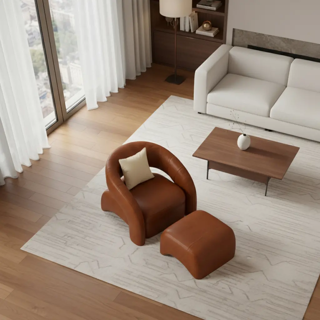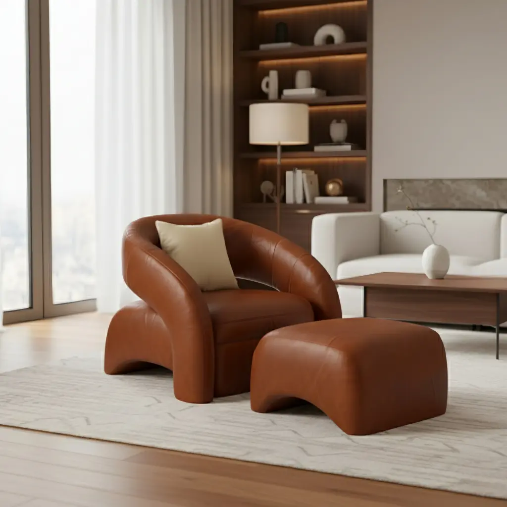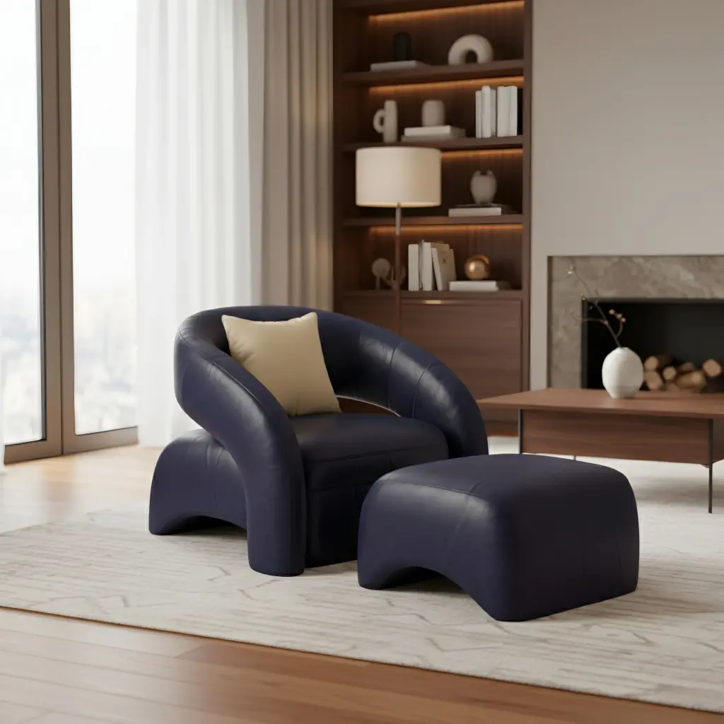 Tek kişilik rahat berjer koltuk ile önündeki puf, evine hem estetik hem pratik bir dokunuş katıyor.