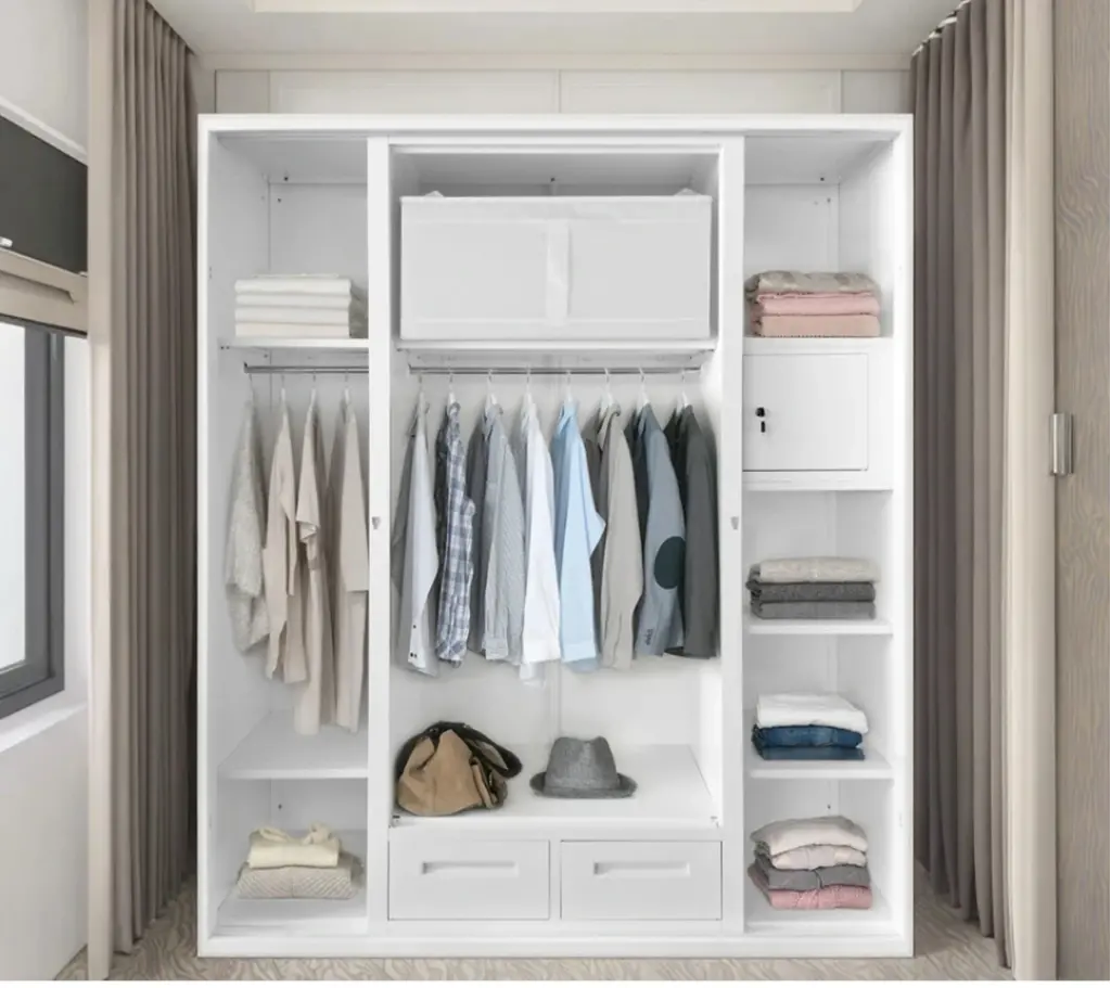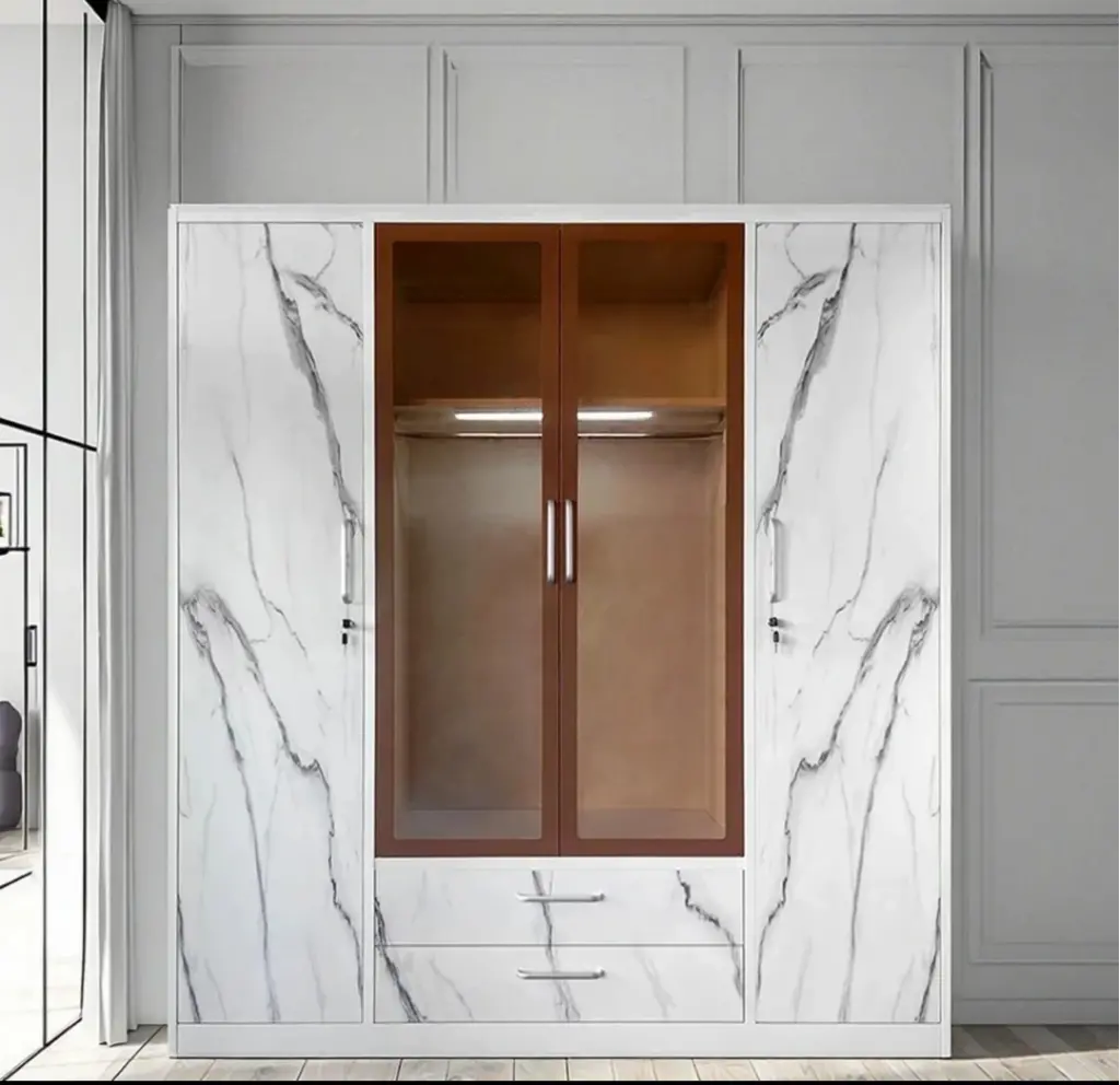 Bu ünite, "Dual Materiality" (İkili Malzeme) mimarisini esas alır. Yan blokları kaplayan beyaz mermer desenli (marble effect) yüzeyler, dolaba sanki bir taş bloktan yontulmuşçasına tok ve monolitik bir hava verir. Bu güçlü "taş kabuk", merkezde yerini amber/füme renkli cam vitrine bırakır. İçerisindeki sıcak LED aydınlatma, camın arkasındaki kıyafetleri bir mağaza vitrini şıklığında sergilerken, mermerin soğuk dokusunu ısıyla dengeler. Vitrin bloğunun altına yerleştirilen ikili geniş çekmece, tasarımın merkezindeki cam kütleyi görsel bir kaideye oturtur.