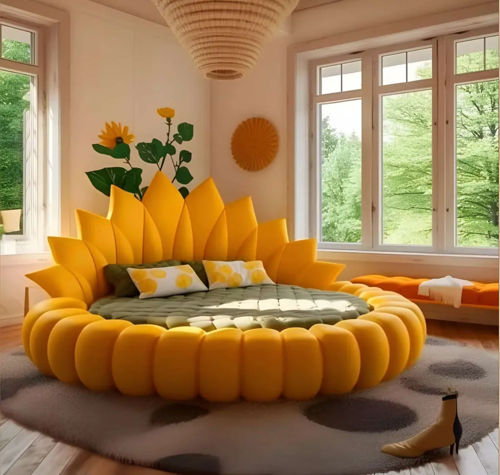 Sıradan yatak odası tasarımlarını unutturan bu muhteşem baza ve başlık seti, doğanın en güzel enerjisini odanıza taşır. Devasa bir ayçiçeği yapraklarını andıran gösterişli başlığı, odaya derinlik ve dramatik bir atmosfer kazandırır. Yumuşak dolgulu, boğumlu detaylara sahip yuvarlak bazası ise hem güvenli bir kullanım sunar (keskin köşe barındırmaz) hem de estetik bütünlüğü tamamlar. Canlı sarı tonlarıyla güne enerjik başlamanızı sağlayan bu tasarım, konforu lüks bir sanat eseriyle buluşturan eşsiz bir başyapıttır.