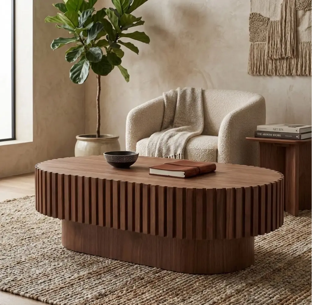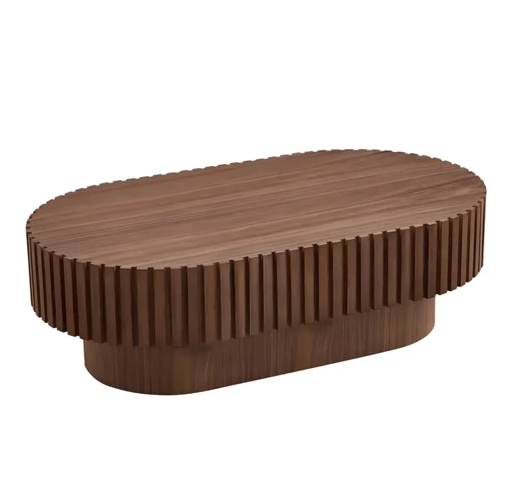 Sıradan düz ve köşeli sehpaların aksine bu ürün, salonunuza yumuşaklık, sıcaklık ve hareket katar. Gövdeyi çepeçevre saran dikey oluklu (fitilli) ahşap doku; tasarıma sadece görsel bir zenginlik değil, aynı zamanda dokunsal bir kalite ve mimari bir karakter kazandırır. Kesintisiz ve geniş oval üst tablası sayesinde dekoratif objeleriniz ve kahve servisleriniz için cömert ve akıcı bir alan yaratır. Doğal ceviz tonlarının sıcaklığı ile oval formun modernliğini buluşturan bu parça, Japandi ve modern evlerin vazgeçilmezi olacak.