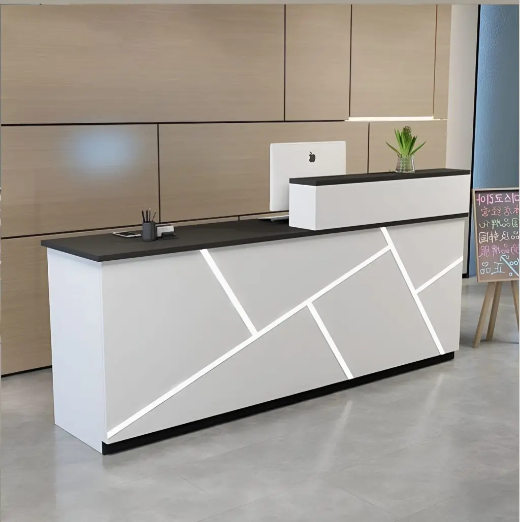 Bu banko, "Geometric Fragmentation" (Geometrik Parçalanma) estetiğiyle kurgulanmıştır. Mat beyaz ön paneli rastgele açılarla kesen entegre LED ışık kanalları, mobilyayı sadece bir masa olmaktan çıkarıp, ofisin enerjisini yansıtan dijital bir ekrana benzetir. Beyaz gövdenin saflığı, üst tabladaki ve zemindeki mat siyah detaylarla çerçevelenerek net bir kontrast oluşturur. Sağ taraftaki yükseltilmiş monitör bloğu (privacy riser), hem çalışana gizli bir alan yaratır hem de tasarıma ikinci bir katman ekleyerek monotonluğu kırar.