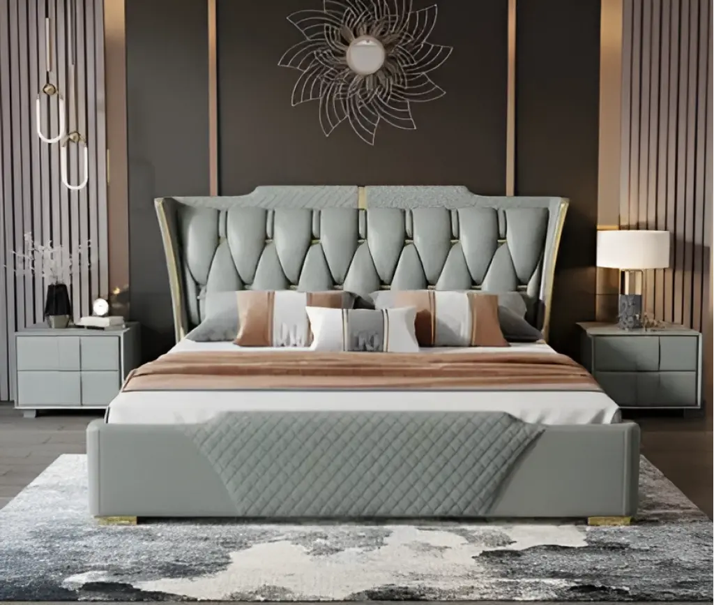 Bu çift kişilik baza, başlık ve yatak takımı, yatak odanıza fonksiyonellik ve şıklık katıyor. Başlık, düğmeli kapitone detayları ve yumuşak kumaş kaplaması ile rahat bir sırt desteği sunar. Baza, sağlam yapısı ve geniş saklama alanı ile eşyalarınızı düzenli tutmanızı sağlar.