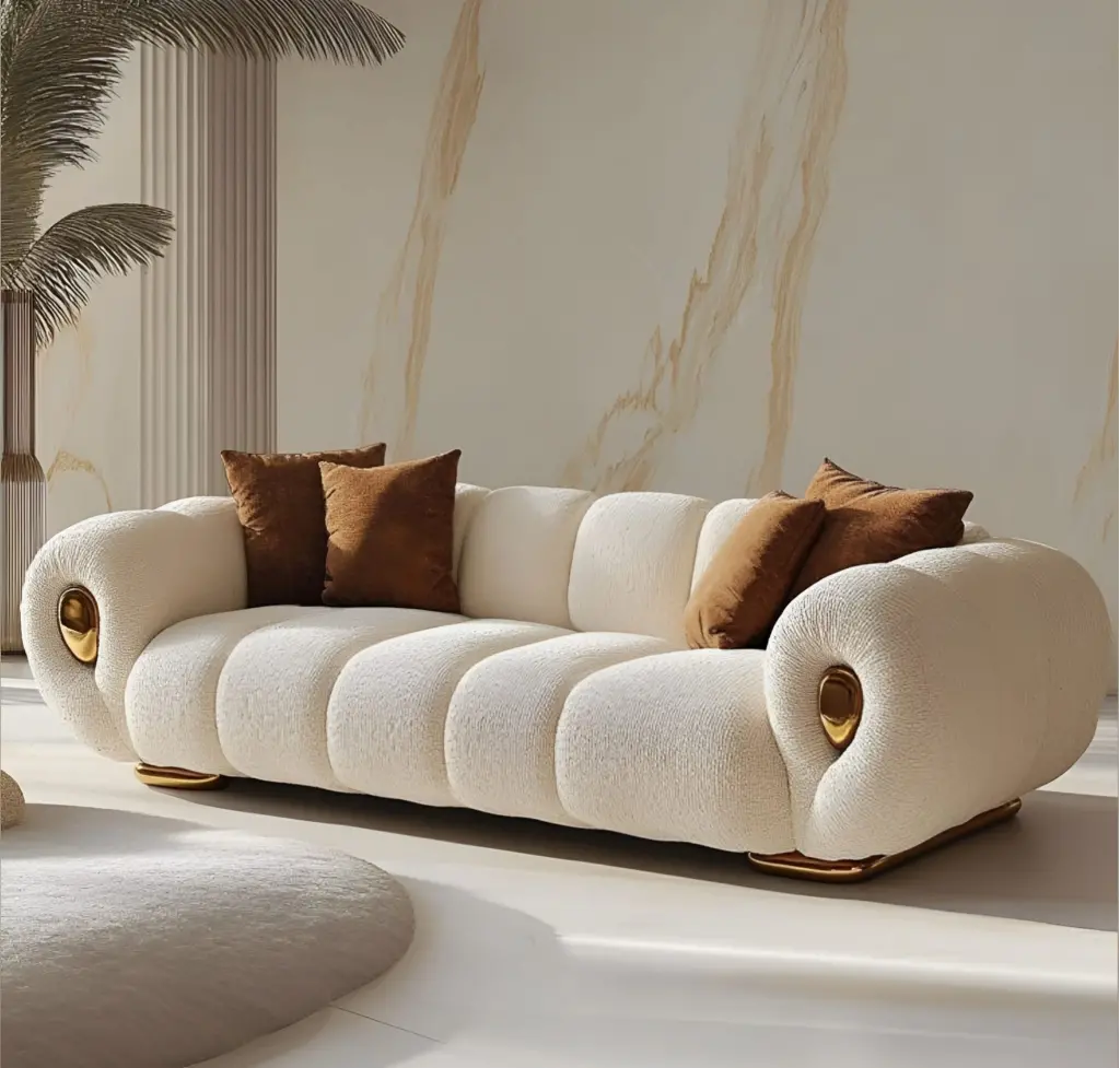 Bu kanepe, "Jewelry Hardware" (Mücevher Donanımı) trendinin en net örneğidir. Gövdeyi oluşturan dikey boğumlu (channel tufted) yapı, ürüne "yan yana dizilmiş marshmallowlar" gibi pofuduk ve ritmik bir derinlik kazandırır. Ancak tasarımın asıl imzası, yuvarlak kolçakların ön yüzüne gömülmüş olan parlak altın (gold/brass) metal halkalardır. Bu detay, bembeyaz ve kıvırcık Bukle (Bouclé) kumaşın matlığıyla kusursuz bir tezat oluşturur. Üzerindeki koyu taba/kahve kadife yastıklar, bu beyaz rüyaya "Toprak ve Altın" temasını ekleyerek tasarımı daha da zenginleştirir.