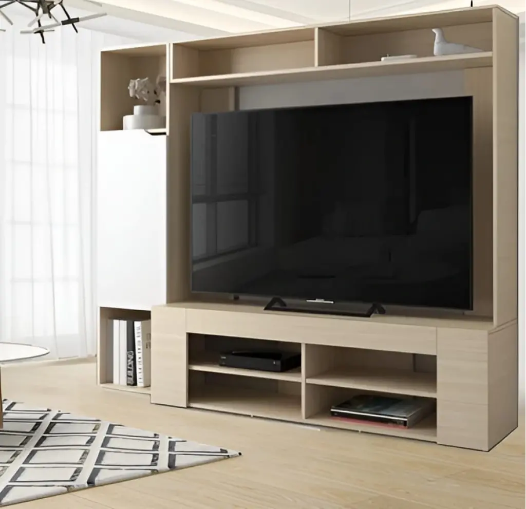 Zarif tasarımı ve fonksiyonelliği bir araya getiren bu TV ünitesi, yaşam alanınıza sofistike bir dokunuş katıyor. Ortada televizyon bölümü yer alırken, çevresindeki 2–3 adet raf dekoratif objeler, kitaplar veya aksesuarlar için şık bir sergileme alanı sunuyor. Alt bölümde ise eşyalarınızı düzenli tutmanız için fonksiyonel depolama alanları bulunuyor.
