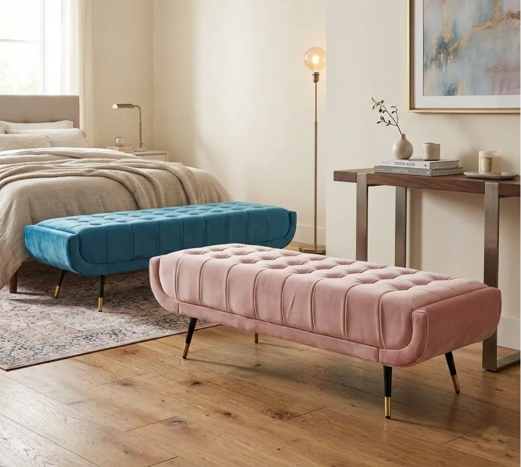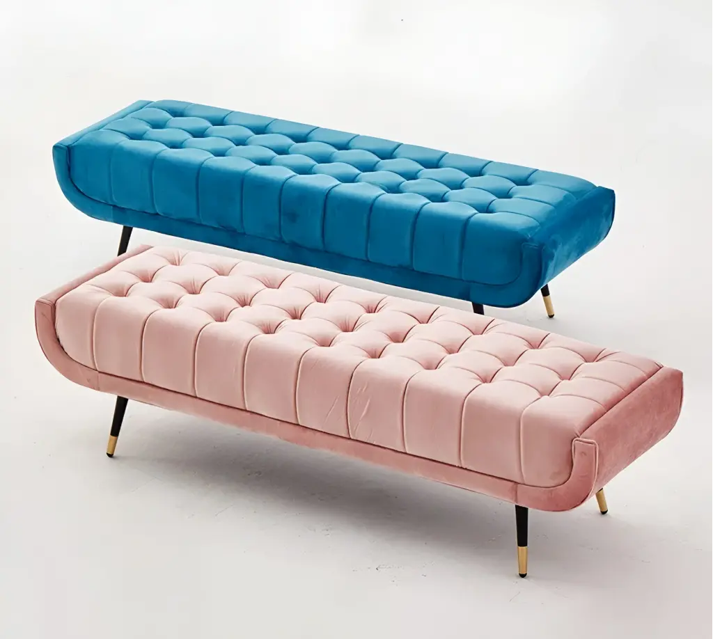 Bu seri, "Curved Wing Architecture" (Kıvrımlı Kanat Mimarisi) estetiğini benimser. Oturma yüzeyinin uç kısımlarındaki bu yukarı yönlü eğim, bankı sadece bir oturma aracı olmaktan çıkarıp, kullanıcıyı sarmalayan estetik bir objeye dönüştürür. Üst yüzeydeki derin düğmeli kapitone, kadifeye klasik bir zenginlik katarken; yan yüzeylerdeki modern dikey fitil dikişler bu klasikliği dengeler. Görseldeki Turkuaz Mavi ve Pudra Pembe seçenekleri, siyah konik ayakların ucundaki altın pabuçlarla (gold sabots) birleşerek tasarıma "Retro-Glam" (Parıltılı Retro) bir kimlik kazandırır.