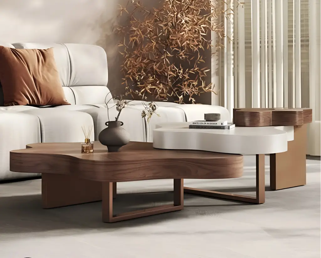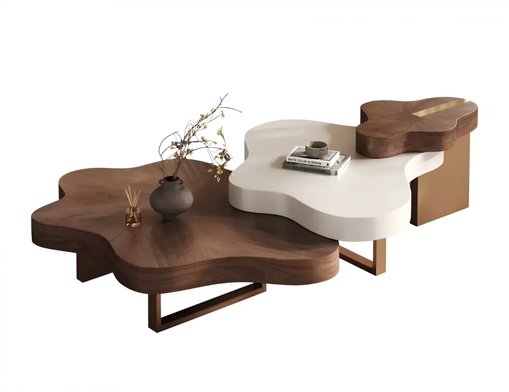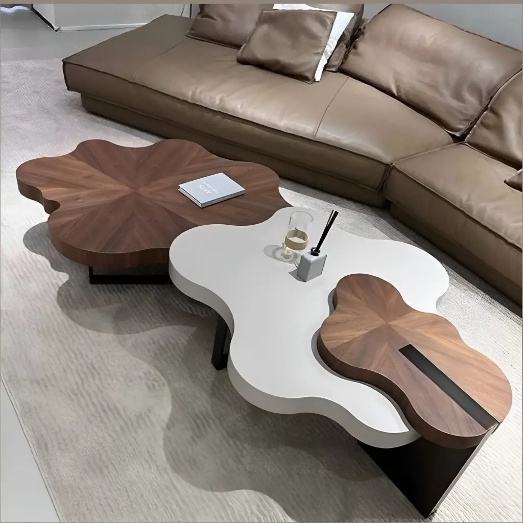 Bu set, "Organic Abstraction" (Organik Soyutlama) prensibiyle tasarlanmıştır. Üstteki koyu ceviz sehpa, merkezden dışa yayılan radyal kaplama (sunburst veneer) işçiliğiyle bir çiçeği veya yaprağı andırır. Alttaki mat beyaz lake modül ise, bu doğal ahşap dokuyu modern bir sadelikle dengeler. Tasarımın en vurucu detayı; beyaz sehpanın üzerine "yama" gibi eklenmiş, sanki üstteki sehpadan kopup oraya düşmüş gibi duran ahşap amorf parçadır. Bu detay, iki bağımsız sehpayı görsel olarak birbirine bağlar ve ürüne üç boyutlu bir "topografik harita" derinliği katar.