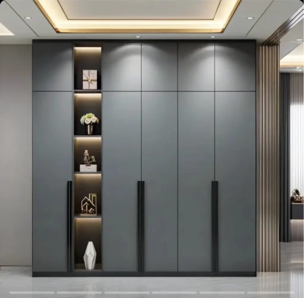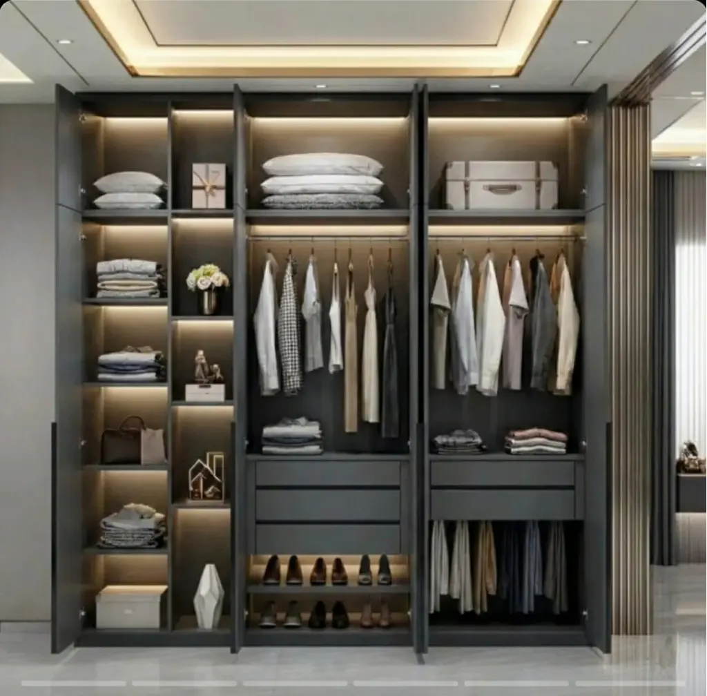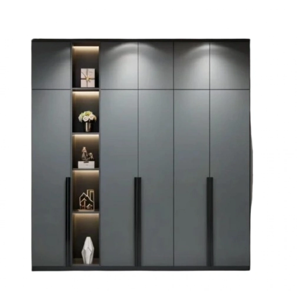 Fonksiyonelliği ve modern tasarımıyla öne çıkan bu gardırop, yatak odanıza hem şıklık hem de düzen kazandırıyor. Orta bölümde yer alan raflar, aksesuarlar, dekoratif objeler veya sık kullanılan eşyalar için ideal bir depolama alanı sunar. Yan ve alt bölmelerdeki kapaklı alanlar ise kıyafetlerinizi ve diğer eşyalarınızı düzenli bir şekilde saklamanıza yardımcı olur.