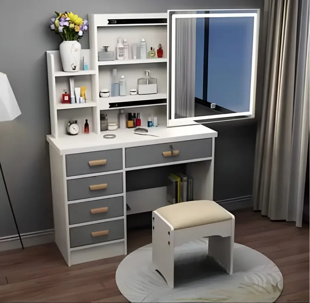 Zarafet ve işlevselliği bir araya getiren bu makyaj masası takımı, şıklığıyla odanıza modern bir hava katar. Ön yüzü tamamen ayna kaplama tasarımı ile bulunduğu alanı ferah gösterirken, kaydırmalı bölmeleri sayesinde çok daha fazla saklama alanı sunar. Yaslanma yeri olmayan fakat rahat tasarlanmış sandalyesiyle konforlu kullanım sağlar.