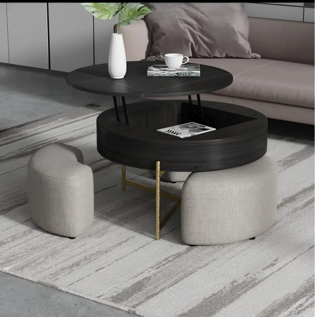 Sıradan sabit sehpaların aksine bu ürün, salonunuza fonksiyonellik ve zeka katar. Yükselip alçalabilen hareketli üst tablası sayesinde anında bir çalışma masasına veya keyifli bir yemek alanına dönüşürken; iç haznesindeki gizli depolama alanı, ortalıktaki dağınıklığı şık bir şekilde gizler. Gövdeyle kusursuzca bütünleşen gizli puflar, ihtiyaç anında ekstra oturma alanı sunarak tasarıma sadece görsel bir şıklık değil, aynı zamanda mimari bir işlevsellik kazandırır. Siyahın asaleti ile gold detayların ışıltısını buluşturan bu parça, modern ve kompakt evlerin vazgeçilmezi olacak.