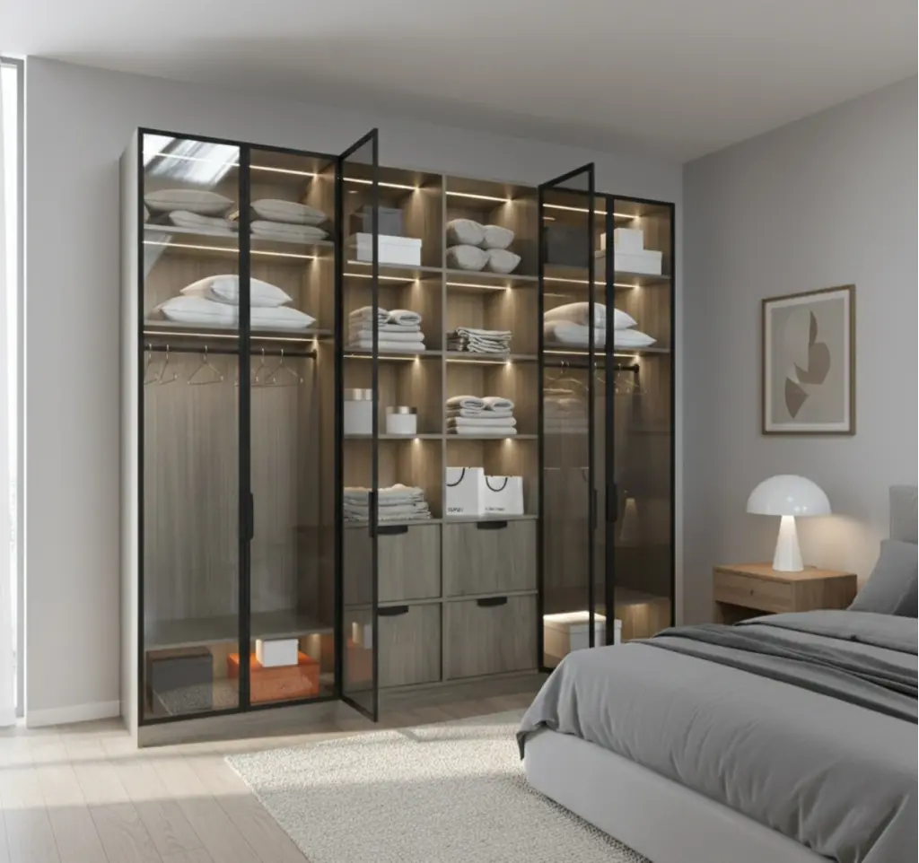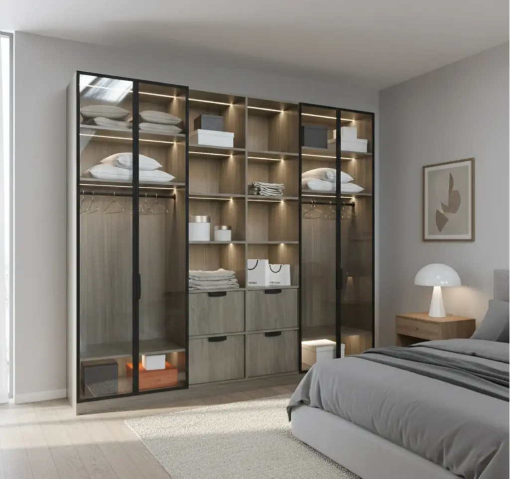Bu tasarım, kapalı kutu algısını yıkarak giyinme alanınıza "mağaza vitrini" estetiği getiriyor. Soğuk gri ahşap dokusunun dinginliği, siyah metal profillerin endüstriyel netliğiyle çerçevelenmiş durumda. Yan bloklardaki cam kapaklar, en sevdiğiniz parçaları tozdan korurken sergilemenize olanak tanır; orta bloktaki açık raf sistemi ve çekmeceler ise gündelik akışınıza hız katar. Raflara entegre edilmiş gizli LED aydınlatmalar, dolabın içindeki her parçayı bir sanat eseri gibi aydınlatarak yatak odanızda loş ve sofistike bir atmosfer yaratır.