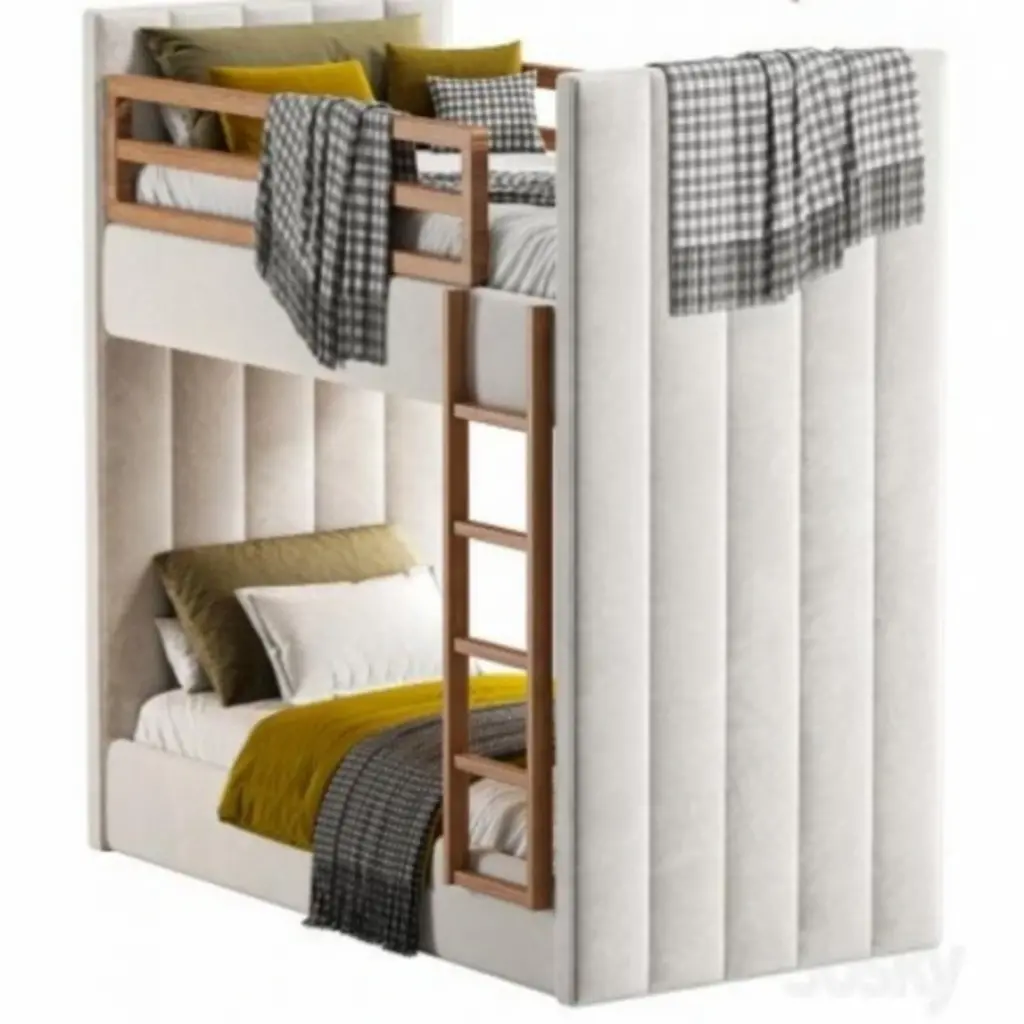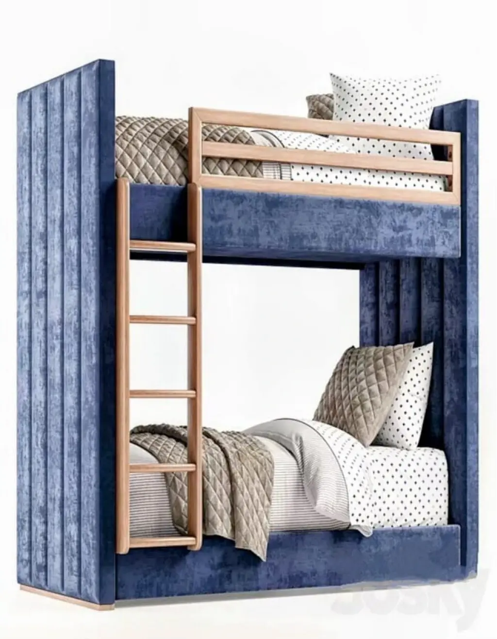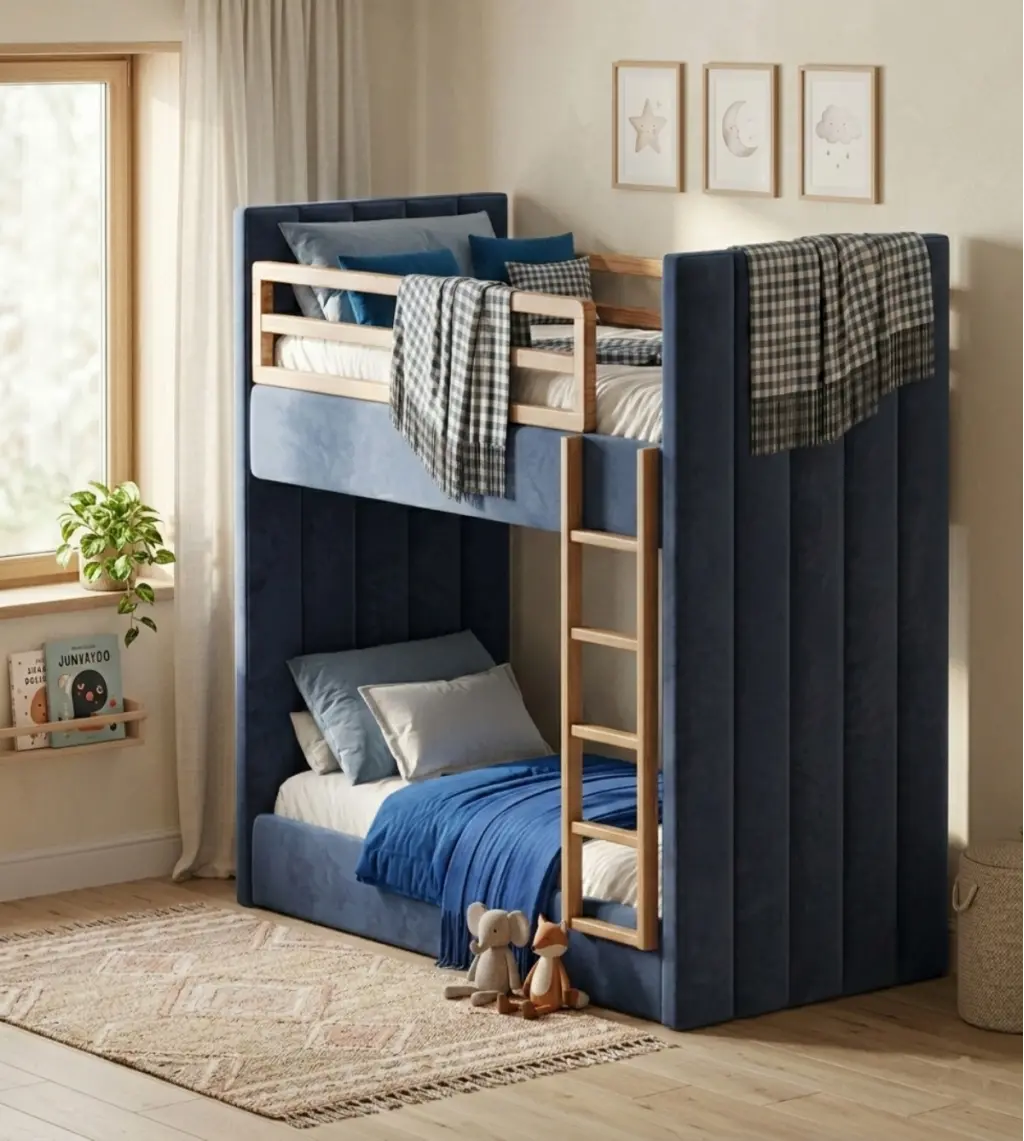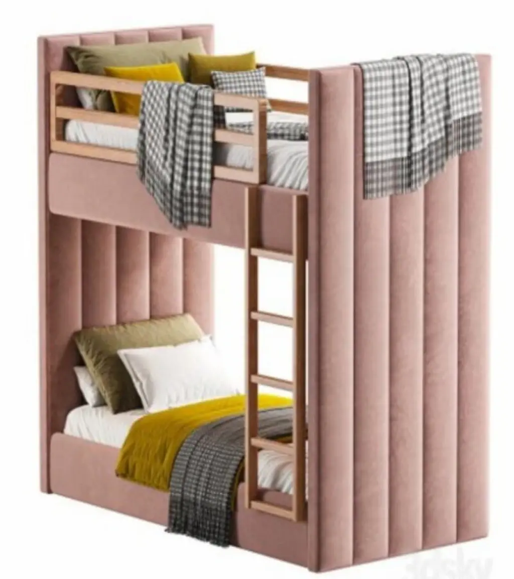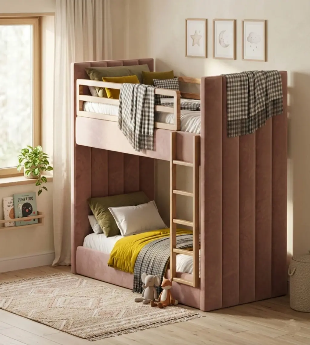 Bu ranza, "Vertical Channeling" (Dikey Oluk) estetiğini benimser. Yan panelleri zeminden tavana kadar kaplayan devasa pudra pembe (blush pink) kadife bloklar, üzerindeki derin dikey dikişlerle tavanı görsel olarak daha yüksek gösterir. Bu yumuşak "sandviç" yapı, uyku alanını dış dünyadan izole eder. Tasarımın sıcaklığını dengeleyen unsur ise doğal ahşap (natural wood) merdiven ve korkuluk detaylarıdır. Ahşabın mat dokusu ile kadifenin parlaklığı, "İskandinav-Chic" bir uyum yakalar. Bu sadece bir yatak değil, çocuğunuz için devasa, güvenli ve sarılabilir bir oyuncaktır.