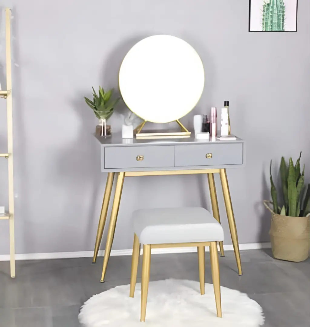 Zarif ve modern tasarımıyla öne çıkan bu makyaj masası seti, odanıza şıklık katarken kullanım kolaylığı da sunuyor. Geniş yuvarlak aynası sayesinde makyaj yaparken ferah bir alan sağlar. Masası minimalist çizgilerle tasarlanmış olup, üzerine rahatça eşyalarınızı yerleştirebilirsiniz. Konforlu sandalyesiyle birlikte hem estetik hem de işlevsel bir bütünlük oluşturur.