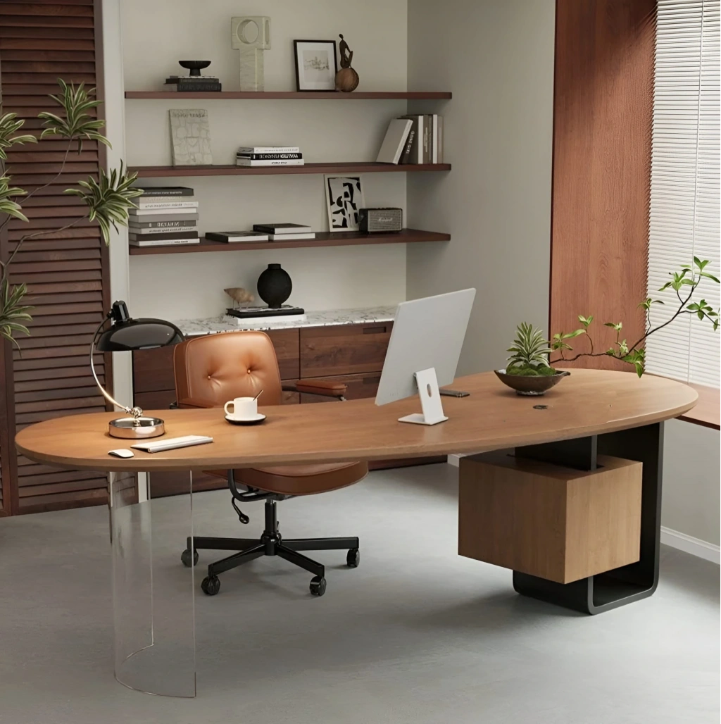 Klasik ofis mobilyalarının ağırlığını şeffaf detaylarla kıran bu masa, modern yöneticiler için tasarlanmış bir güç simgesidir. Masanın bir tarafındaki blok depolama ünitesi (keson), sağlam ve oturaklı bir duruş sergilerken; diğer uçtaki şeffaf akrilik/cam ayak, masanın sanki havada asılı durduğu izlenimini verir. Böbrek formundaki kavisli yapısı (organik form), kullanıcıyı sararak ergonomik bir çalışma alanı sunar ve tüm yüzeye hakimiyet sağlar. İster cesur kırmızı tonuyla dinamik bir enerji, ister doğal ahşap dokusuyla sofistike bir ağırlık; bu tasarım her iki seçenekte de ofisinizin odak noktası olacak.