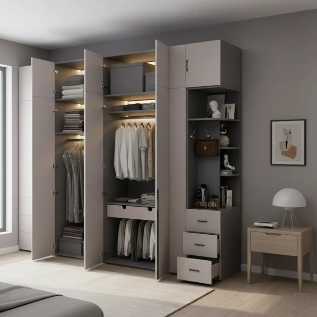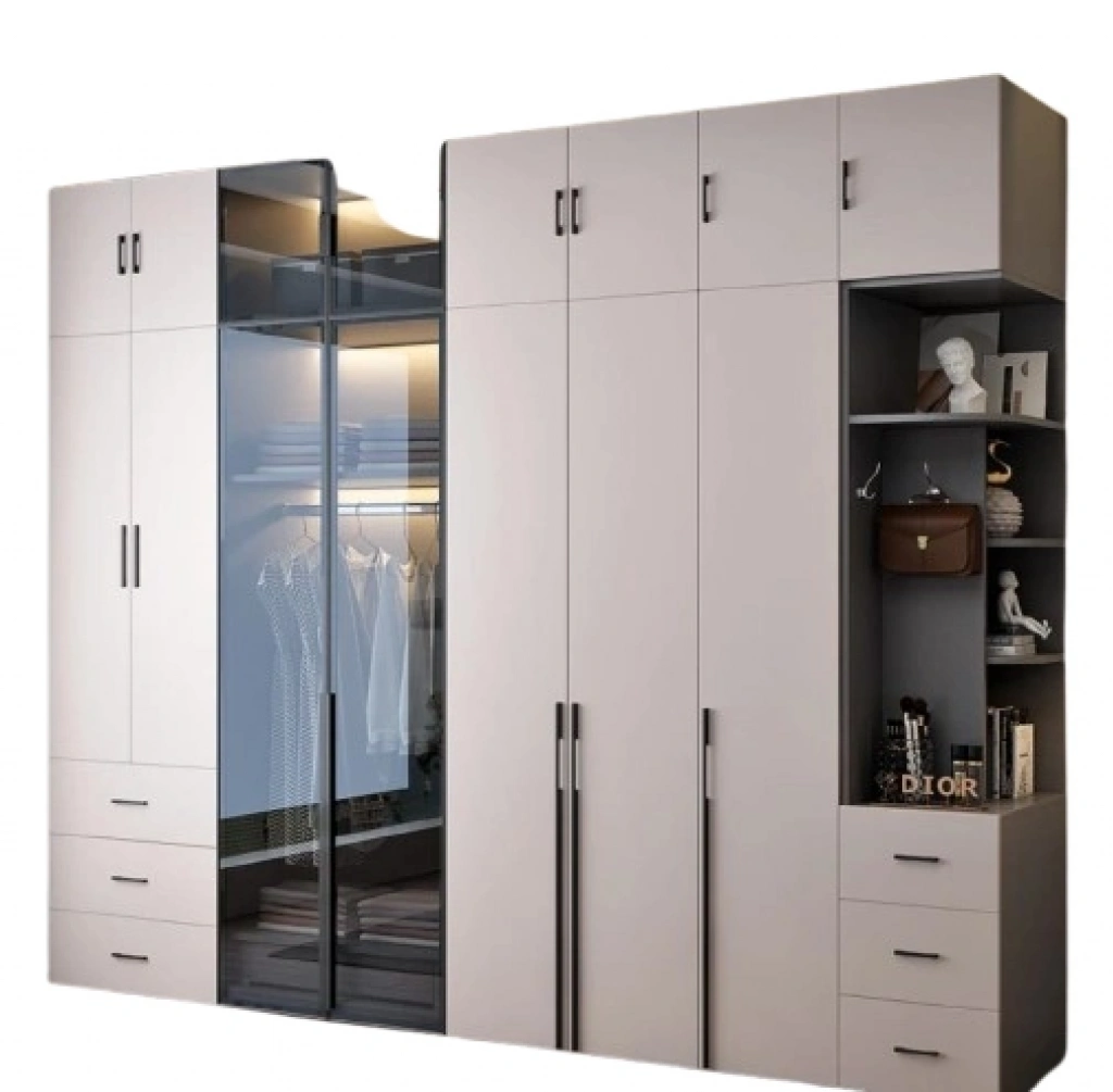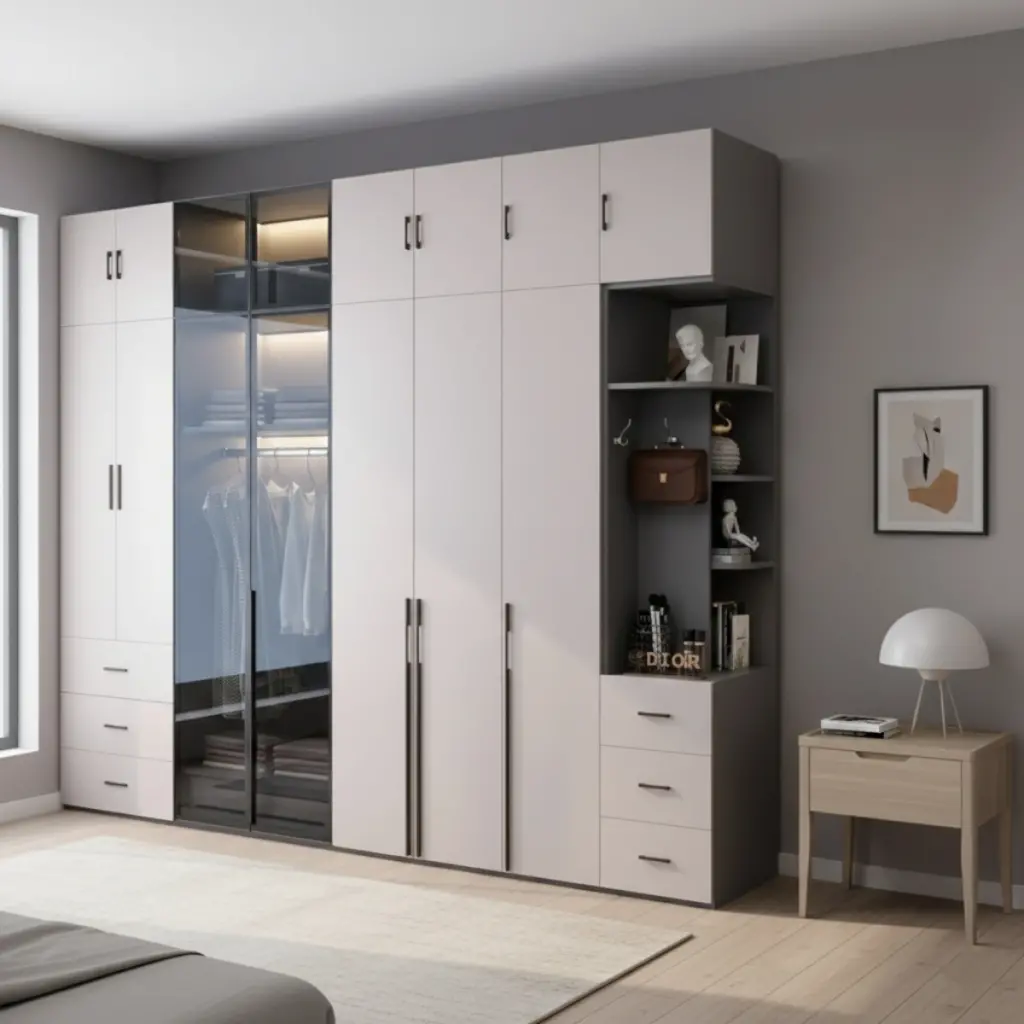 Şık ve fonksiyonel tasarımıyla öne çıkan bu gardırop, yatak odanıza hem düzen hem de estetik kazandırıyor. Orta bölümdeki camlı kapak, kıyafet ve aksesuarlarınızı dekoratif bir şekilde sergilerken, sağ taraftaki raflı bölüm günlük kullanım veya dekoratif objeler için ideal bir alan sunar. Yan ve alt kapaklı bölmeler ise geniş depolama alanı sağlayarak tüm eşyalarınızı düzenli bir şekilde saklamanıza yardımcı olur.