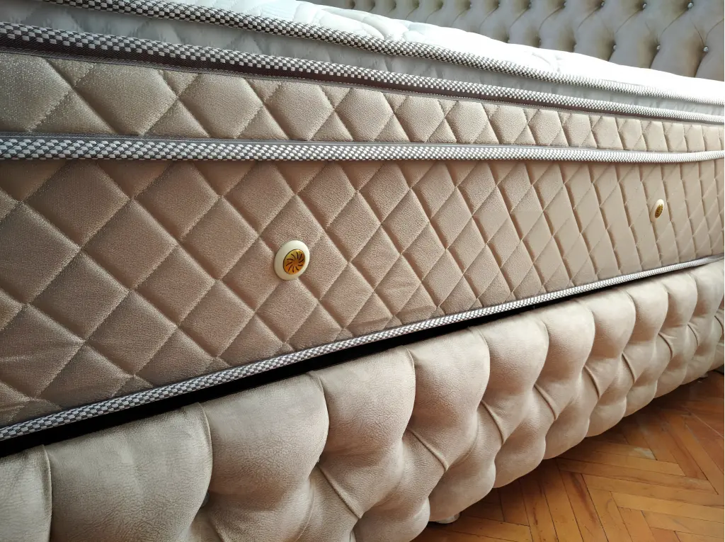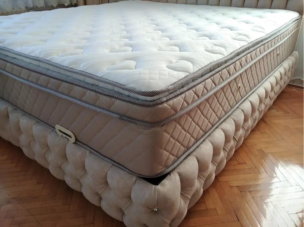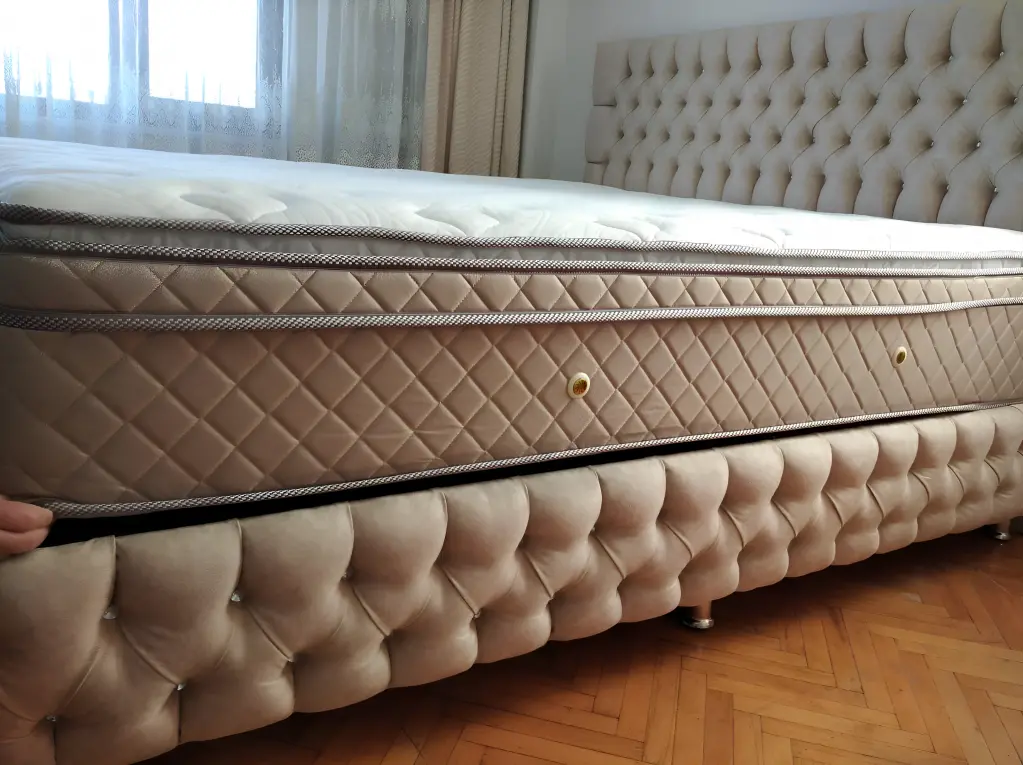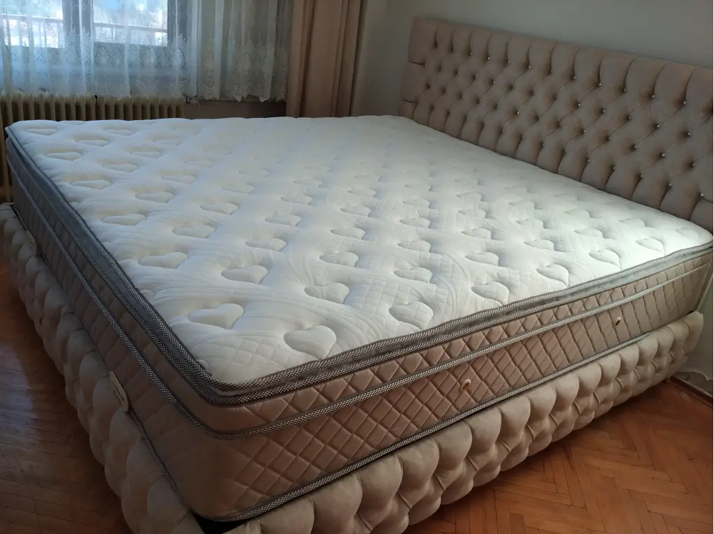 Yatak odanızda hem rahatlık hem de estetik görünüm arıyorsanız, bu çift kişilik baza ve başlık takımı ideal bir tercihtir. Düğmeli kapitone detaylarıyla süslenmiş başlık, yumuşak yapısıyla hem şık bir görünüm hem de konforlu bir yaslanma alanı sunar. Baza ise güçlü iskeleti ve geniş iç hacmiyle nevresim, yastık ve diğer eşyalarınız için pratik bir saklama alanı sağlar.