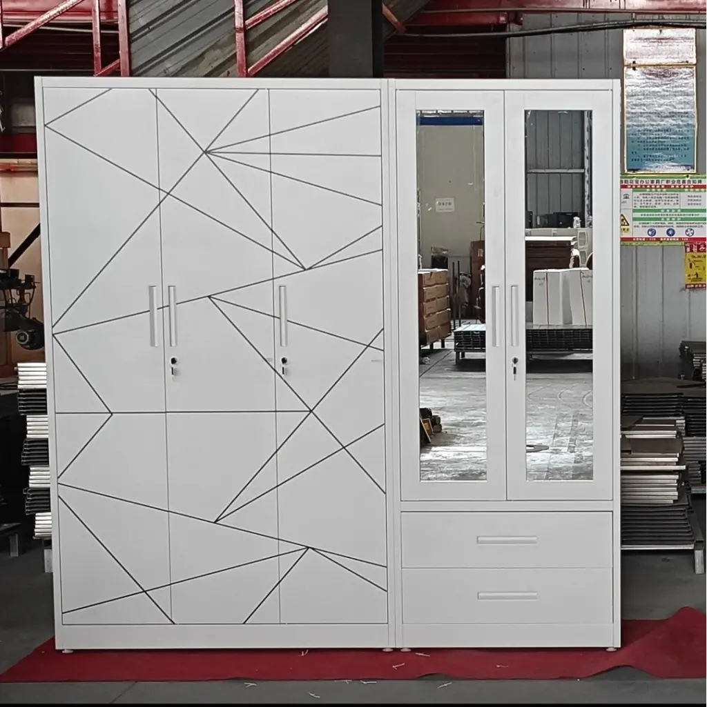 Bu tasarım, klasik beyaz gardırop anlayışını asimetrik geometri ile yeniden yorumluyor. Sol bloktaki kapaklarda birbirini kesen siyah çizgiler, yüzeyde adeta bir "kırılma" veya "origami" etkisi yaratarak dolaba üç boyutlu bir derinlik hissi kazandırıyor. Bu dinamik kaos, sağ bloktaki aynalı kapakların dinginliği ve netliği ile dengelenmiş durumda. Aynalar, odadaki ışığı ve deseni yansıtarak mekanın sınırlarını genişletirken; alt kısımdaki geniş çekmeceler ve kilit detaylı kulplar, tasarıma endüstriyel bir fonksiyonellik ekliyor.